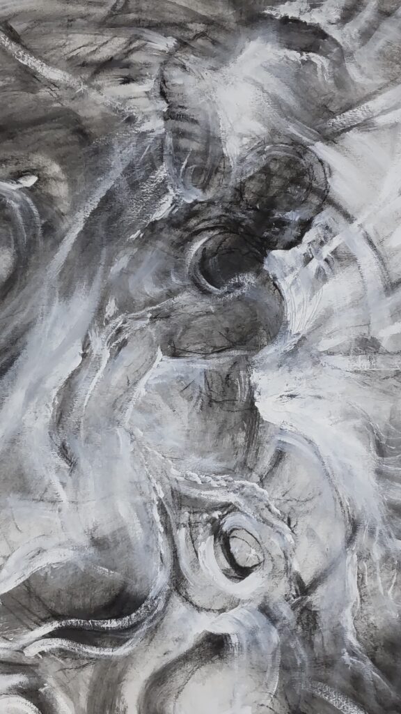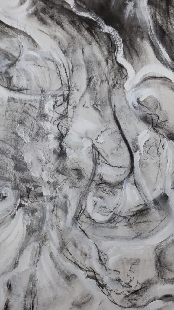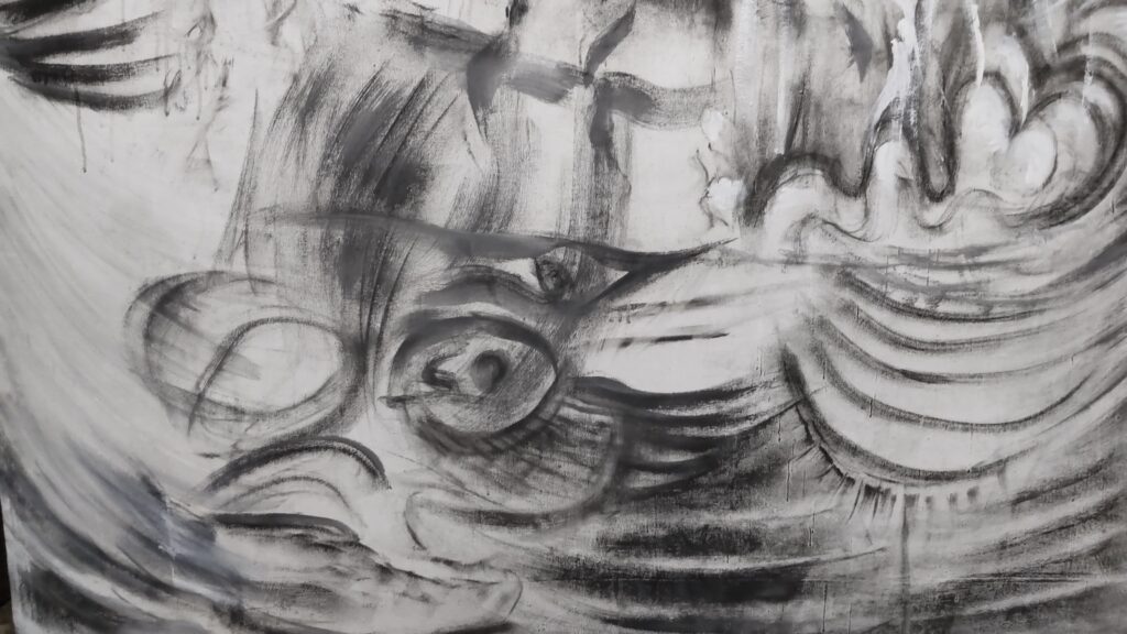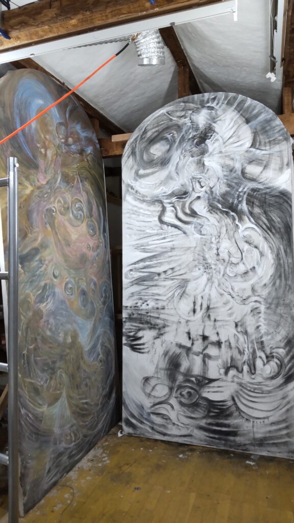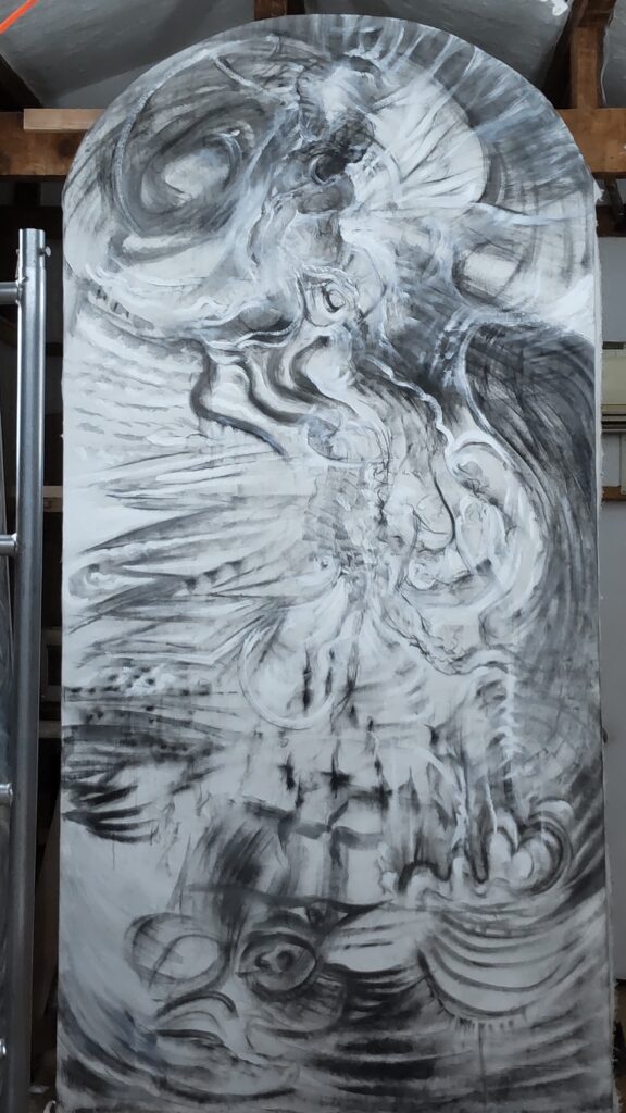渡麓・菅原神社の物自体”の未だ完成してない工程中の作品は別の未完成の大作・”京都の三十三間堂の内存”と二対一体にした斬新的試みで,どんな建造物にも美学的観点から見て一体化し順応できるように絵画上部を故意に弓形にして西洋の障壁画的特殊性を潜ませてる。